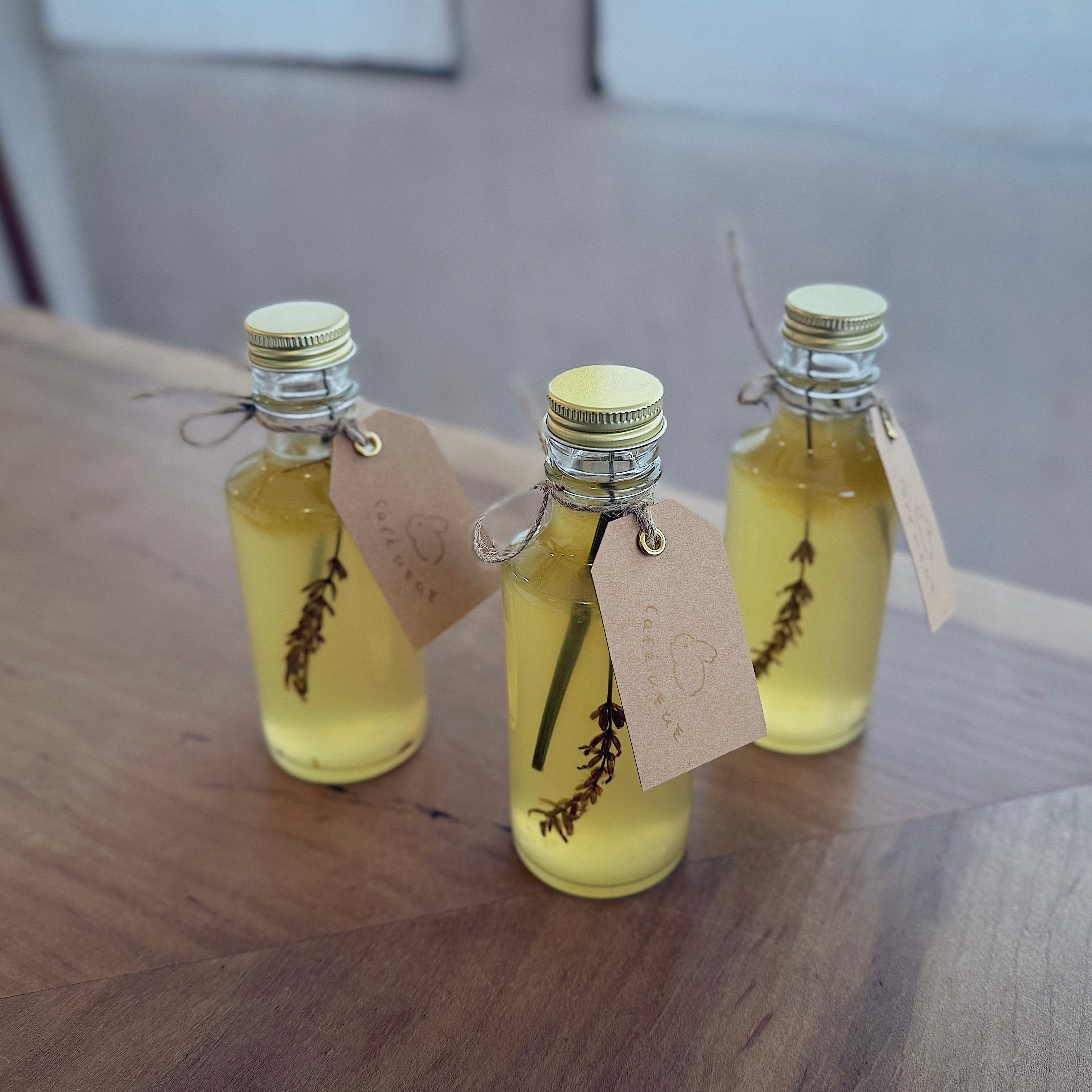 トコハル農園の葡萄、マスカット系の白ぶどうにひそひその庭で育てた農薬不使用のハーブ、ミント・ラベンダー・レモングラス・ローズマリーを合わせてシロップにしました。トコハル農園の葡萄の中で出荷出来ない不揃いな部分を使いシロップを仕込んでいます。ハーブが香る甘酸っぱく爽やかなぶどうのシロップです。