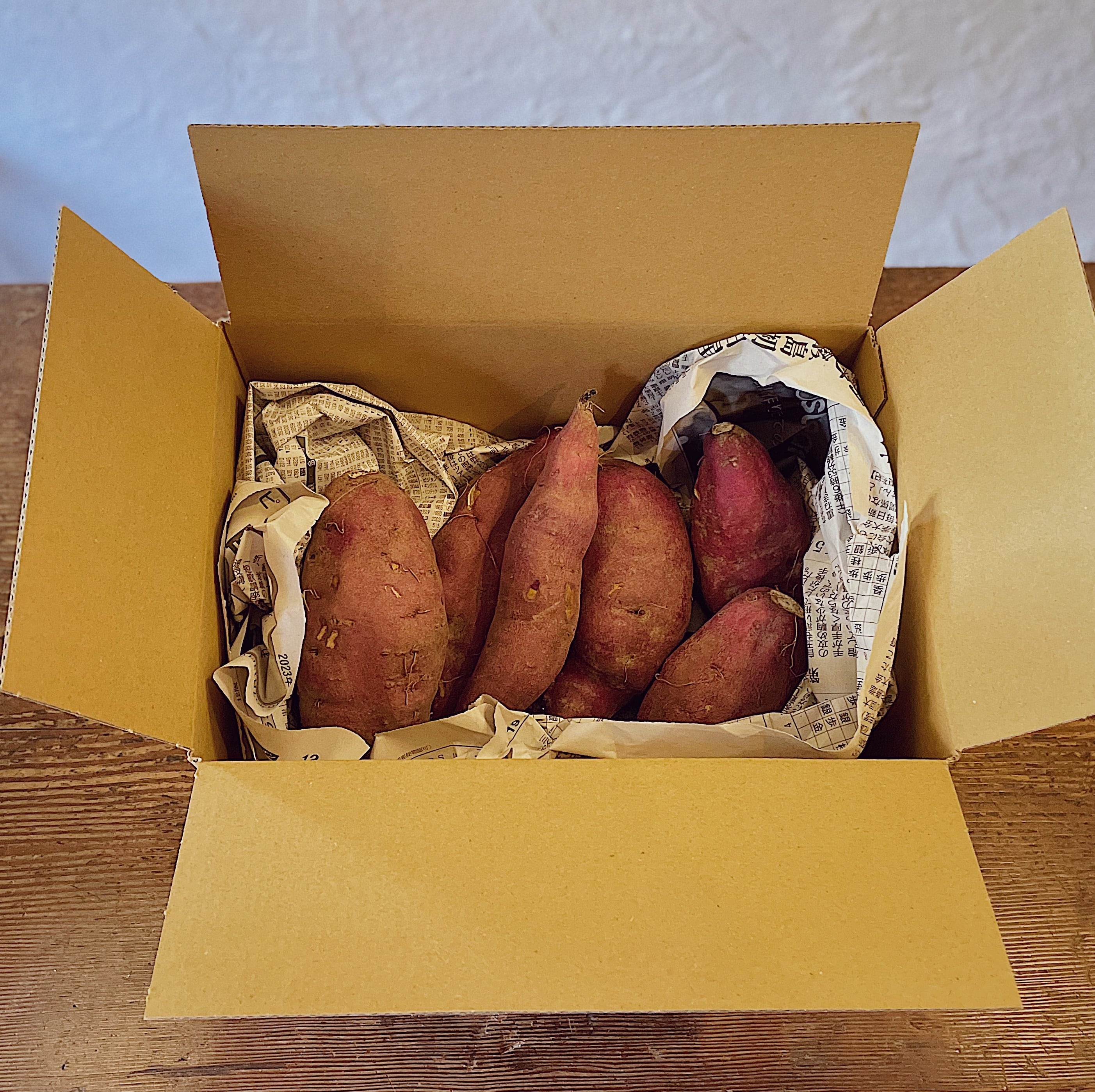 さつまいも単品の商品は写真2枚目の様に新聞紙に包んで段ボールに入れてのお届けになります。