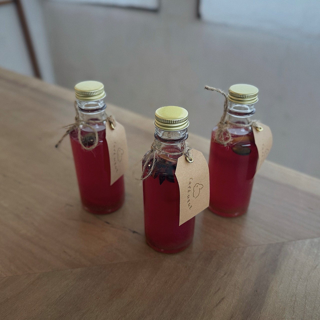 トコハル農園で栽培している葡萄で作る毎年人気のシロップです。出荷出来ない不揃いな部分や房から落ちた実をお砂糖で漬け込み、クローブ、シナモン、八角、カルダモンなどのスパイスを合わせて煮詰めています。葡萄の風味がぎゅっと濃縮されたような深いぶどう色のシロップに、スパイスの風味が香るこれからの寒い季節にぴったりのシロップが出来ました。