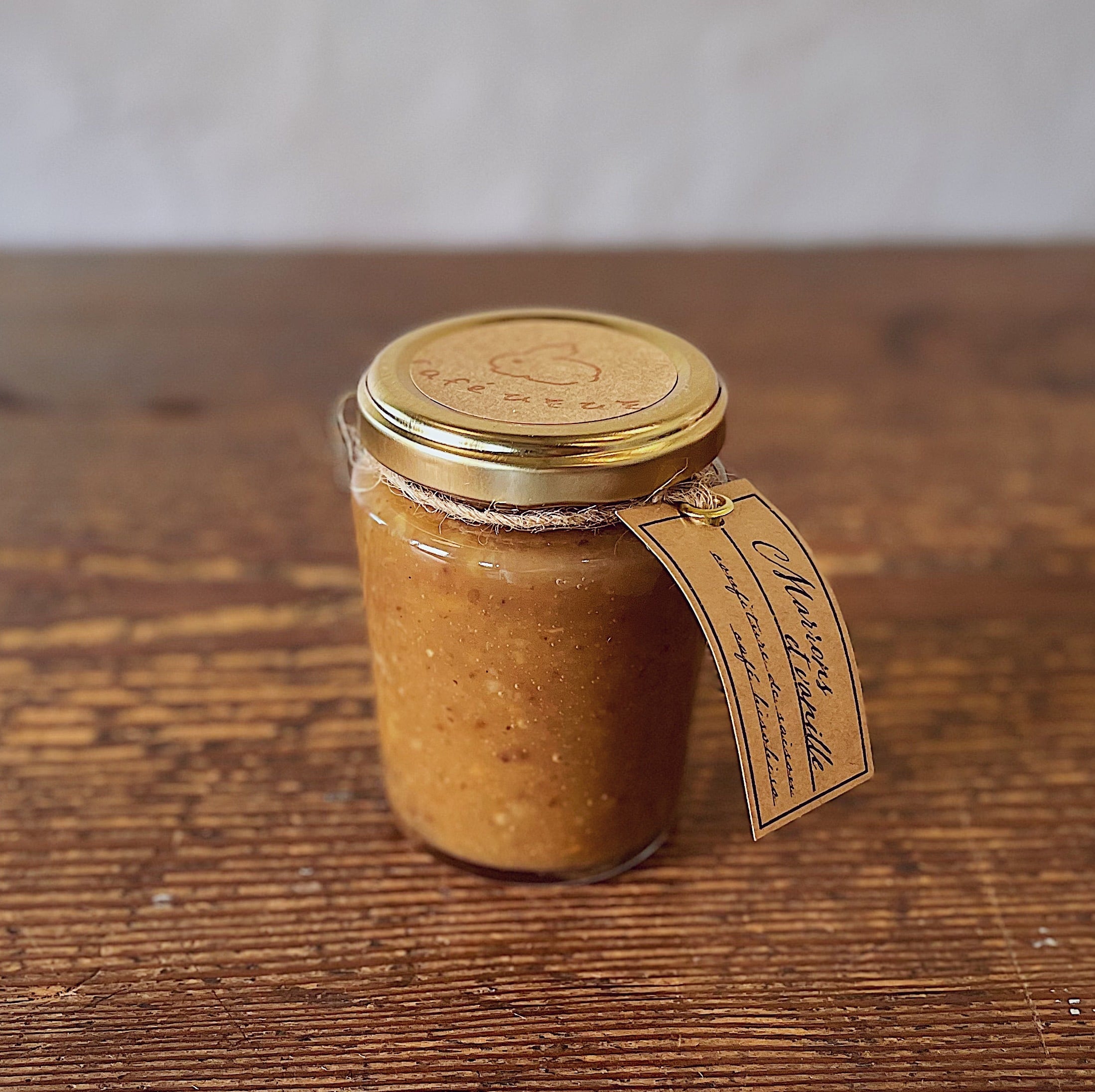 今年は地元奈良県産の大粒の栗を使用。栗の皮を丁寧に剥き、バニラビーンズを加えてコトコトと煮込みました。栗のほくほくとした食感と香ばしさにバニラビーンズの甘い香りが合わさった風味豊かな秋の人気コンフィチュールです。