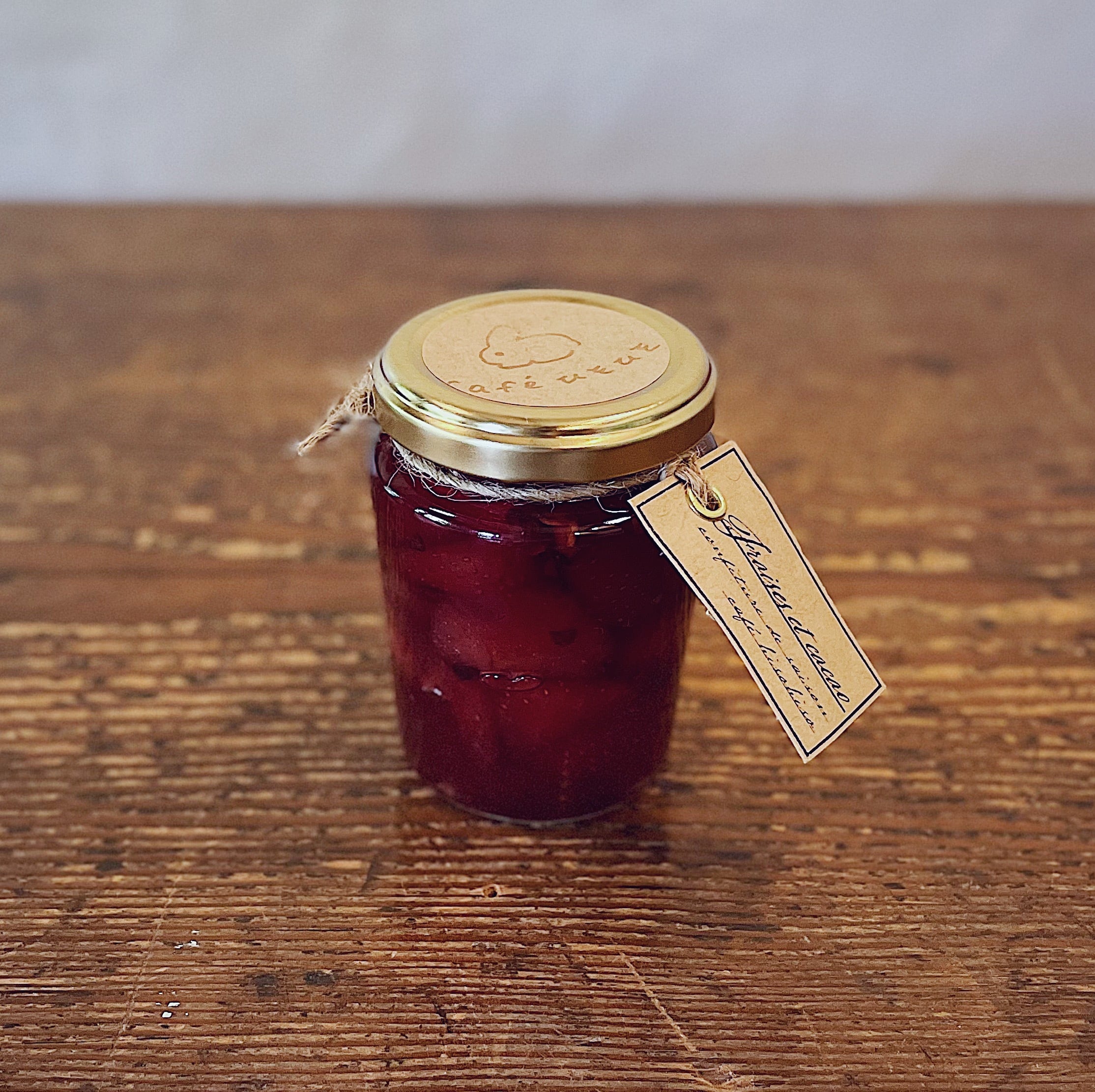奈良県産の真っ赤ないちごにカカオニブを加えほんのりとチョコレートのような風味が加わったコンフィチュールです。隠し味の赤ワインで香りに深みが増しました。(長時間加熱しているためアルコールは飛んでいます)